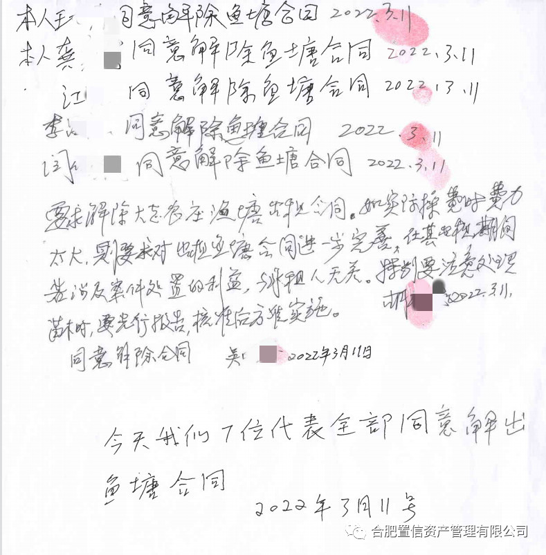 因部分集资参与人强烈建议,经多轮协调,承租人承诺无条件放弃鱼塘租赁,报工作组同意后,依法协商解除《大志农庄水塘及附属板房租赁合同》。