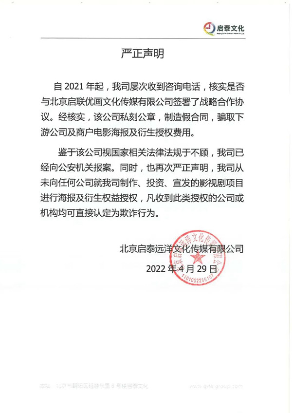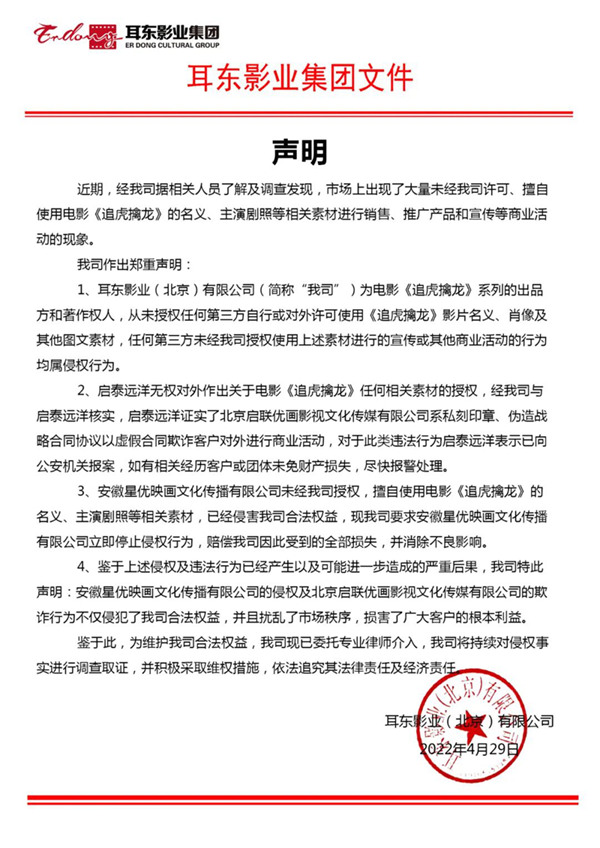 耳东影业集团(品今控股集团) 2022.4.29……官方声明。近期,经我司据相关人员了解及调查发现,市场上出现了大量未经我司许可、擅自使用电影《追虎擒龙》的名义、主演剧照等相关素材进行销售、推广产品和宣传等商业活动的现象。我司作出郑重声明:1、耳东影业(北京)有限公司(简称“我司”) 为电影《追虎擒龙》系列的出品方和著作权人,从未授权任何第三方自行或对外许可使用《追虎擒龙》影片名义、肖像及其他图文素材,任何第三方未经我司授权使用上述素材进行的宣传或其他商业活动的行为均属侵权行为。2、启泰远洋无权对外作出关于电影《追虎擒龙》任何相关素材的授权,经我司与启泰远洋核实,启泰远洋证实了北京启联优画影视文化传媒有限公司系私刻印章、伪造战略合同协议以虚假合同欺诈客户对外进行商业活动,对于此类违法行为启泰远洋表示已向公安机关报案,如有相关经历客户或团体未免财产损失,尽快报警处理。3、安徽星优映画文化传播有限公司未经我司授权,擅自使用电影《追虎擒龙》的名义、主演剧照等相关素材,已经侵害我司合法权益,现我司要求安徽星优映画文化传播有限公司立即停止侵权行为,赔偿我司因此受到的全部损失,并消除不良影响。……启泰文化严正声明:自2021年起,我司屡次收到咨询电话,核实是否与北京启联优画文化传媒有限公司签署了战略合作协议。经核实,该公司私刻公章,制造假合同,骗取下游公司及商户电影海报及衍生授权费用。鉴于该公司视国家相关法律法规于不顾,我司已经向公安机关报案。同时,也再次严正声明,我司从未向任何公司就我司制作、投资、宣发的影视剧项目进行海报及衍生权益授权,凡收到此类授权的公司或机构均可直接认定为欺诈行为。