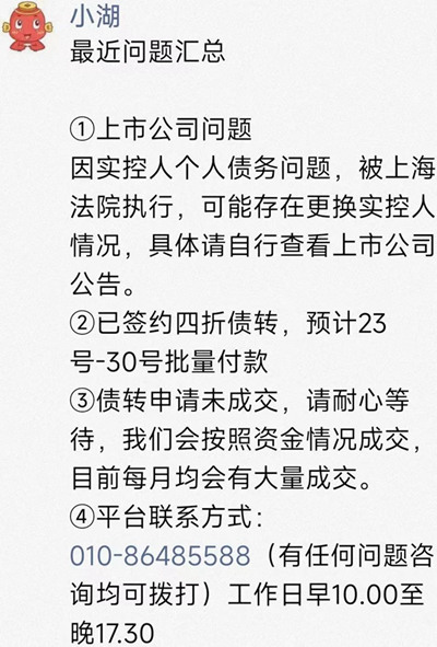 银湖网、熊猫金库网贷平台 2022.5.16……小湖:最近问题汇总。①上市公司问题。因实控人个人债务问题,被上海法院执行,可能存在更换实控人情况,具体请自行查看上市公司公告。②已签约四折债转,预计23号-30号批量付款。③债转申请未成交,请耐心等待,我们会按照资金情况成交,目前每月均会有大量成交。