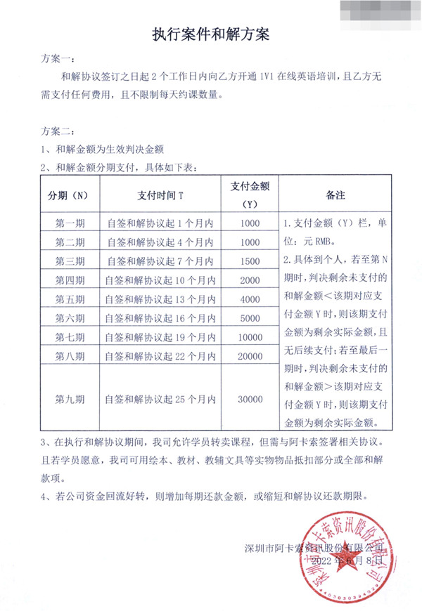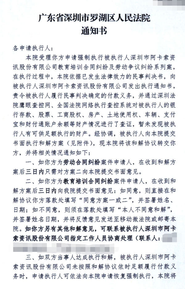 阿卡索国内在线英语培训(阿卡索外教网) 2022.6.22……【法院通知书】昨天和今天,不少进入强制执行的小伙伴收到了法院发的和解协议,协议内容如下:本院受理你方申请强制执行被执行人深圳市阿卡索资讯股份有限公司教育培训合同纠纷及劳动争议纠纷系列案,在执行过程中,本院依据已发生法律效力的民事判决书,向被执行人深圳市阿卡索资讯股份有限公司发出执行通知书,责令被执行人履行民事判决确定的付款义务,并通过深圳法院鹰眼查控网、全国法院网络执行查控系统对被执行人的银行存款、股票、工商股权、房产、土地使用权、车辆、支付宝和财付通账户余额等财产情况进行了查证,暂未发现被执行人有可供足额执行的财产。经协调,被执行人向本院提交书面执行和解方案(见附件),现本院将该和解协议转交你方,并将相关情况通知如下:一、如你方为劳动合同纠纷案件申请人,在收到和解方案后三日内只需对方案二向本院提交书面意见。二、如你方为教育培训合同纠纷案件申请人,在收到和解方案后三日内向我院提交书面意见:如同意,则直接在和解协议你方落款处填写“同意方案一或二”,并签署姓名、日期;如不同意,则须在落款处填写“本人不同意和解”,并签署姓名日期,并将反馈意见发送至移动微法院或邮寄本院。如你方另有其他和解意见,可联系被执行人深圳市阿卡索资讯股份有限公司指定工作人员协商处理。三、如双方当事人达成执行和解,被执行人深圳市阿卡索资讯股份有限公司未按照和解协议依时足额履行付款义务时,申请执行人可依法向本院申请恢复强制执行,本院将会继续依法执行。