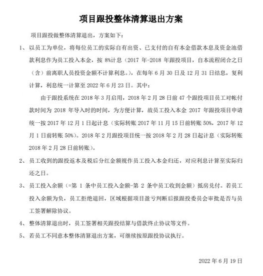 5、若员工不同意本整体清算退出方案,可继续按原跟投协议执行。