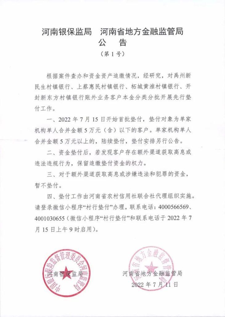 根据案件查办和资金资产追缴情况,经研究,对禹州新民生村镇银行、上蔡惠民村镇银行、柘城黄淮村镇银行、开封新东方村镇银行账外业务客户本金分类分批开展先行垫付工作。