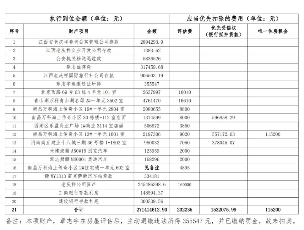 关于江西老庆祥实业开发有限公司、章志雄、赵磊、李雷生、米建波、章志宇非法吸收公众存款罪一案,我院依法有序推进资产处置、信息核实登记等重点工作。为维护集资参与人的合法权益,现依据生效刑事判决书和信息核实登记情况,对已执行到位的涉案资金进行清退,具体事项通告如下: