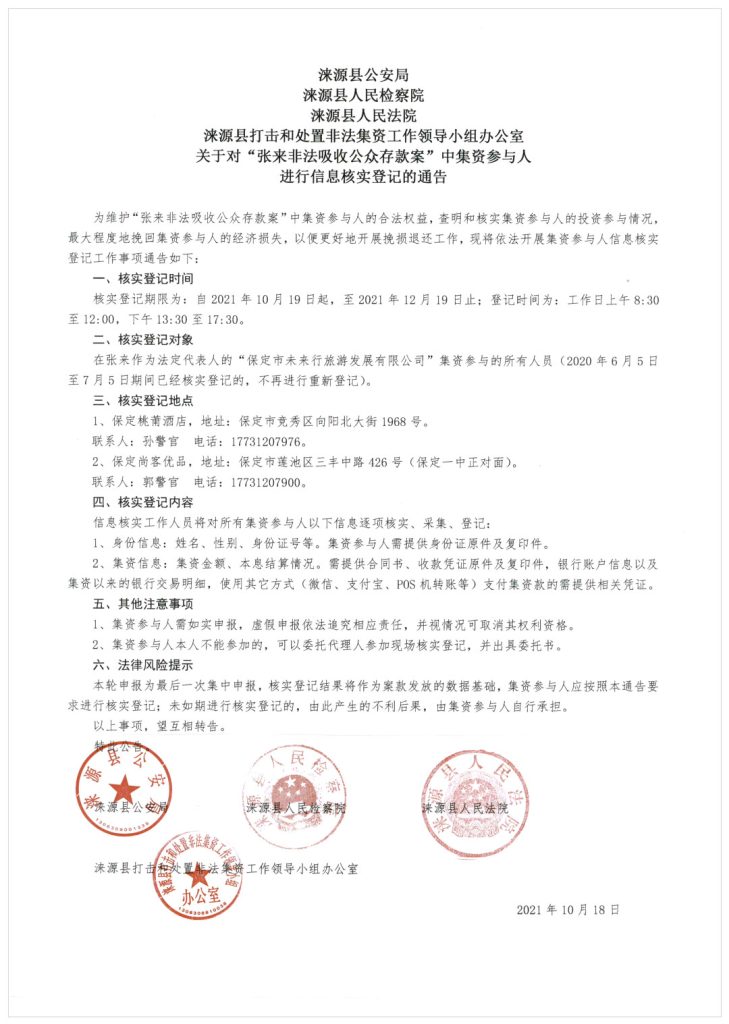 【涞源法院·通告栏】关于对“张来非法吸收公众存款案”中集资参与人进行信息核实登记的通告