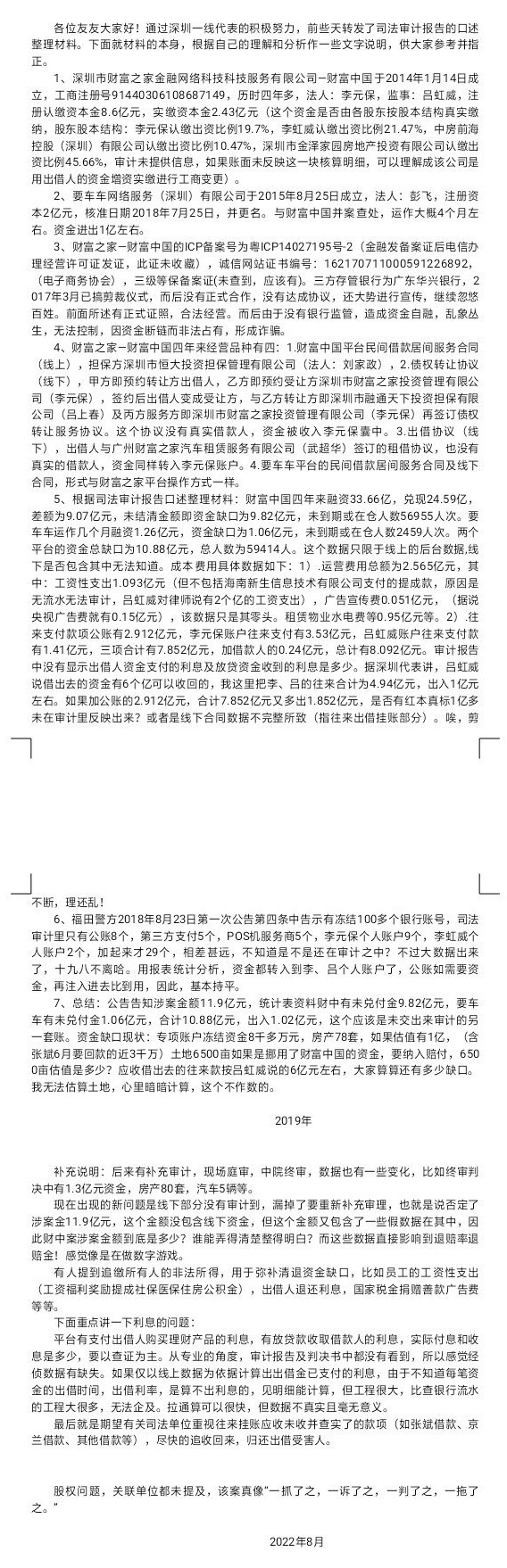 5、根据司法审计报告口述整理材料:财富中国四年来融资33.66亿,兑现24.59亿,差额为9.07亿元,未结清金额即资金缺口为9.82亿元,未到期或在仓人数56955人次。要车车运作几个月融资1.26亿元,资金缺口为1.06亿元,未到期或在仓人数2459人次。两个平台的资金总缺口为10.88亿元,总人数为59414人。这个数据只限于线上的后台数据,线下是否包含其中无法知道。成本费用具体数据如下: 1).运营费用总额为2.565亿元,其中:工资性支出1.093亿元(但不包括海南新生信息技术有限公司支付的提成款,原因是无流水无法审计,吕虹威对律师说有2个亿的工资支出),广告宣传费0.051亿元,(据说央视广告费就有0.15亿元),该数据只是其零头。租赁物业水电费等0.95亿元等。2)往来支付款项公账有2.912亿元,李元保账户往来支付有3.53亿元,吕虹威账户往来支付款有1.41亿元,三项合计有7.852亿元,加借款人的0.24亿元,总计有8.092亿元。审计报告中没有显示出借人资金支付的利息及放贷资金收到的利息是多少。据深圳代表讲,吕虹威说借出去的资金有6个亿可以收回的,我这里把李、吕的往来合计为4.94亿元,出入1亿元左右。如果加公账的2.912亿元,合计7.852亿元又多出1.852亿元,是否有红本真标1亿多未在审计里反映出来?或者是线下合同数据不完整所致(指往来出借挂账部分)。唉,剪不断,理还乱!
