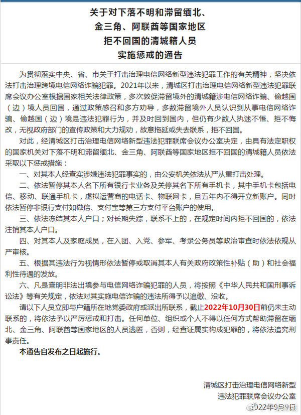 广东清远市清城区打击治理跨境电信网络诈骗犯罪 2022.9.9……【警方通告】​关于对下落不明和滞留缅北、金三角、阿联酋等国家地区拒不回国的清城籍人员实施惩戒的通告。2021年以来,清城区打击治理电信网络新型违法犯罪联席会议办公室根据国家相关法律政策,多次敦促滞留境外的清城籍涉电信网络诈骗、偷越国(边)境人员回国,通过政策感召和多方劝导,多数滞留境外人员认识到从事电信网络诈骗、偷越国(边)境是违法犯罪行为,并及时回到国内,但仍有少数人执迷不悟、拒不悔改,无视政府部门的宣传政策和大力规劝,故意拖延或失去联系,拒不回国。对此,经清城区打击治理电信网络新型违法犯罪联席会议办公室决定,由具有法定职权的国家机关对下落不明和滞留缅北、金三角、阿联酋等国家地区拒不回国的清城籍人员依法采取惩戒措施。截止2022年10月30日前仍未主动联系的,将依法予以严厉惩戒和打击。任何单位、组织或个人不得以任何方式帮助滞留在缅北、金三角、阿联酋等国家地区的人员逃匿,否则,经查证属实构成犯罪的,将依法追究刑事责任。