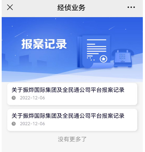 昨日(6日),深圳市公安局福田分局微信公众号“福田警察”中小程序“经侦业务”板块,已接受关于“振烨国际集团及全民通公司”报案资料的提交。