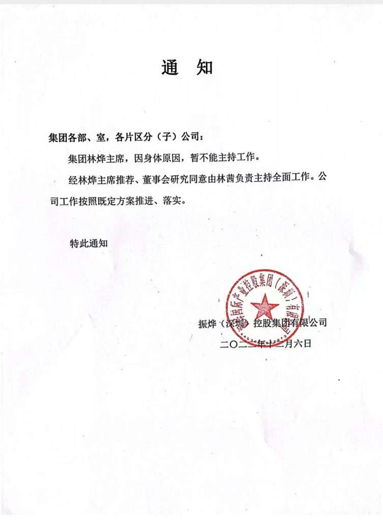 昨日(6日)振烨国际对外公告称身体原因,然后把自己的侄女推上前台,“集团林烨主席,因身体原因,暂不能主持工作。经林烨主席推荐、董事会研究同意由林茜负责主持全面工作。公司工作按照既定方案推进、落实。”