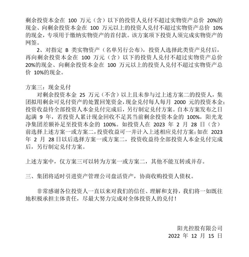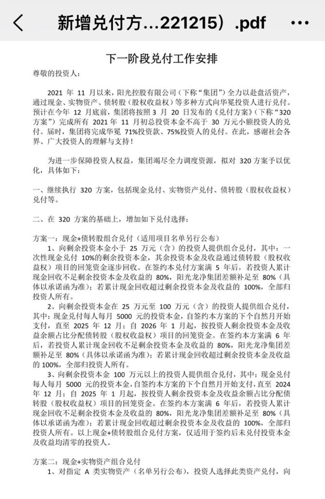阳光城地产华冕财富 2022.12.15……【自媒体】阳光城旗下华冕财富从去年底暴雷至今已一年有余,今天,在220320兑付方案的基础上,增加兑付方案221215,其中纯现金方案每月发2000,时间长达9年!且看新兑付方案: