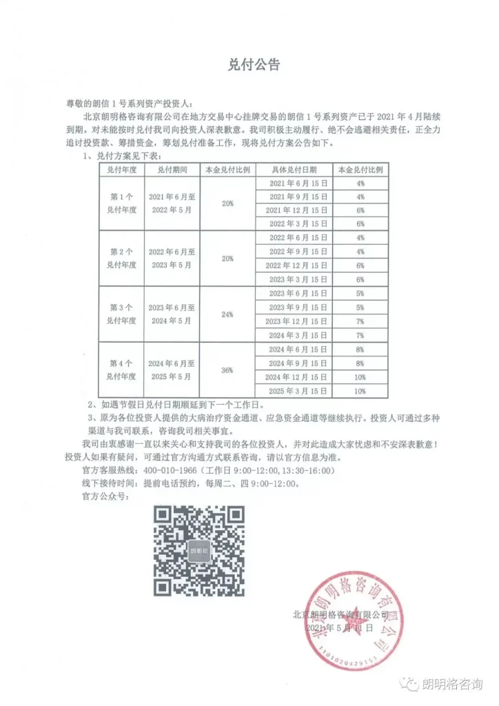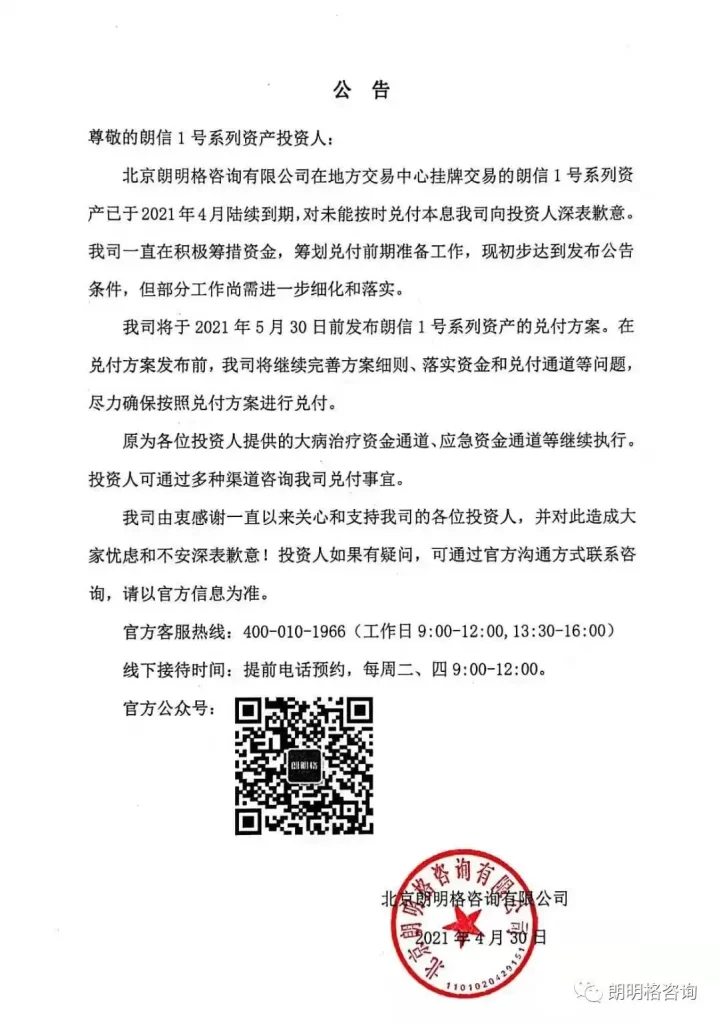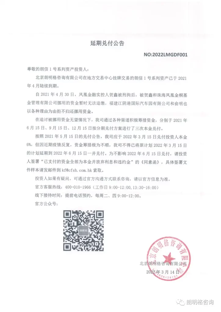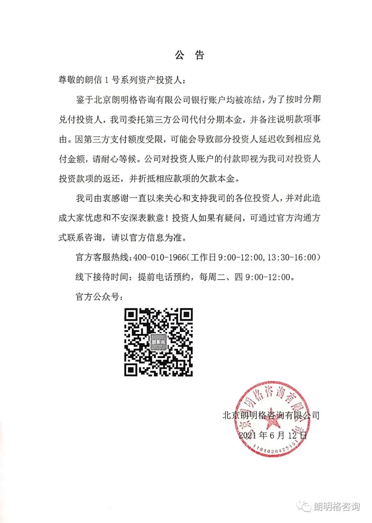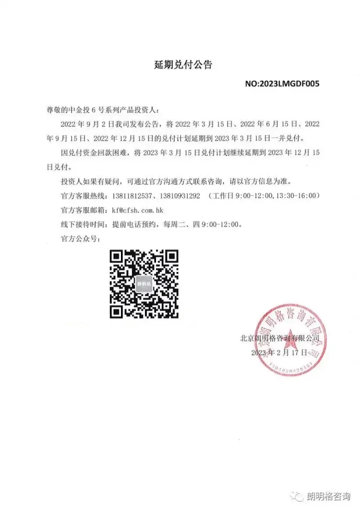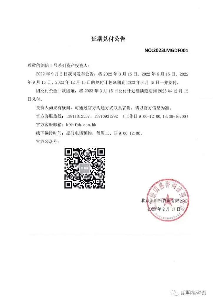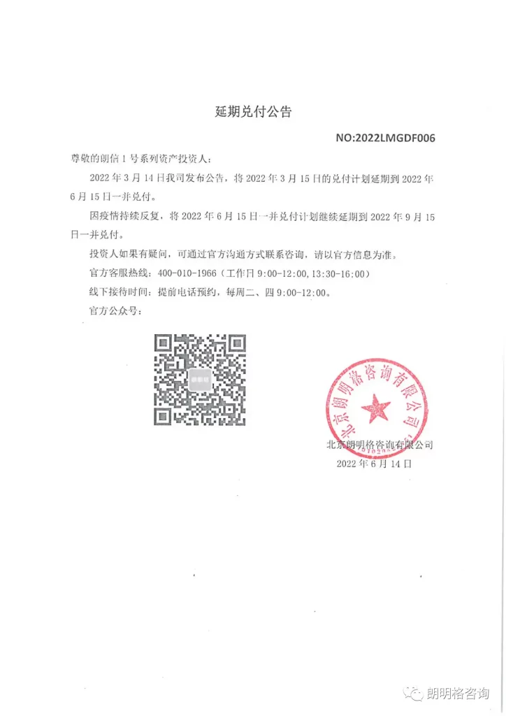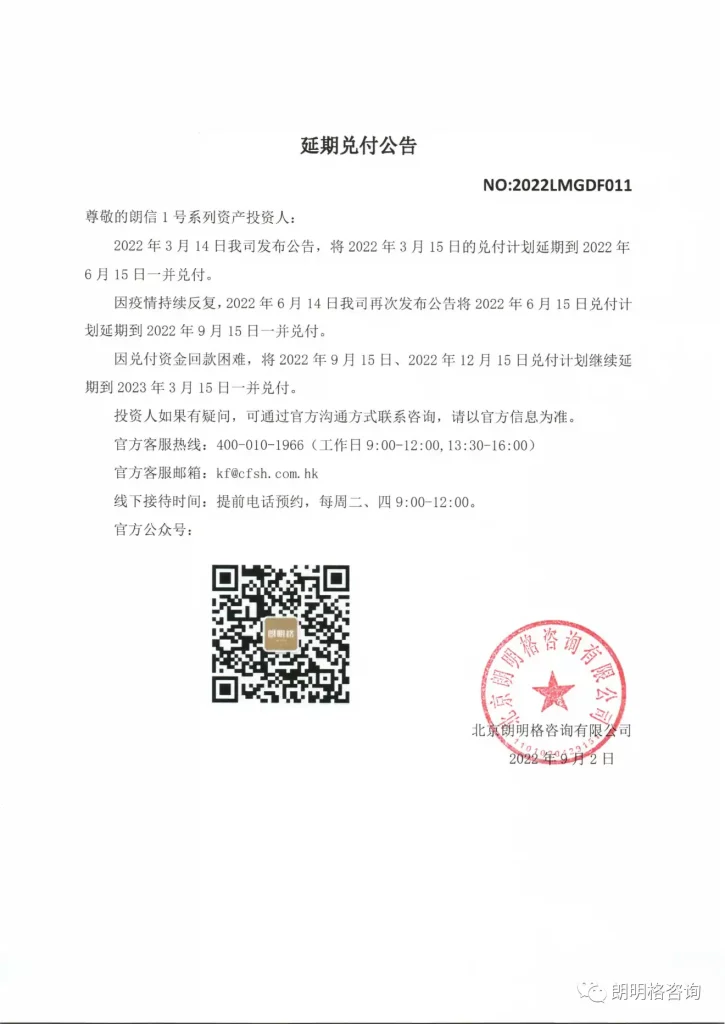 北京朗明格咨询有限公司 2021.4.30-2023.2.17……【公司方发布】朗信1号、2号系列产品,中金投2号、4号、6号系列产品,延期兑付