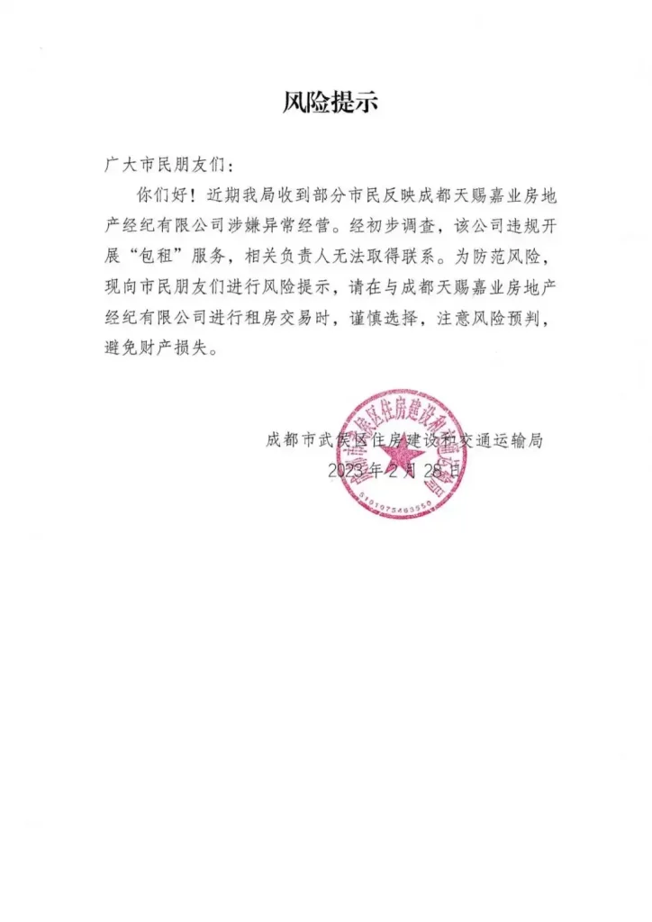 成都天赐嘉业房地产经纪有限公司 2023.2.28……【官方发布】成都市武侯区住房建设和交通运输局风险提示