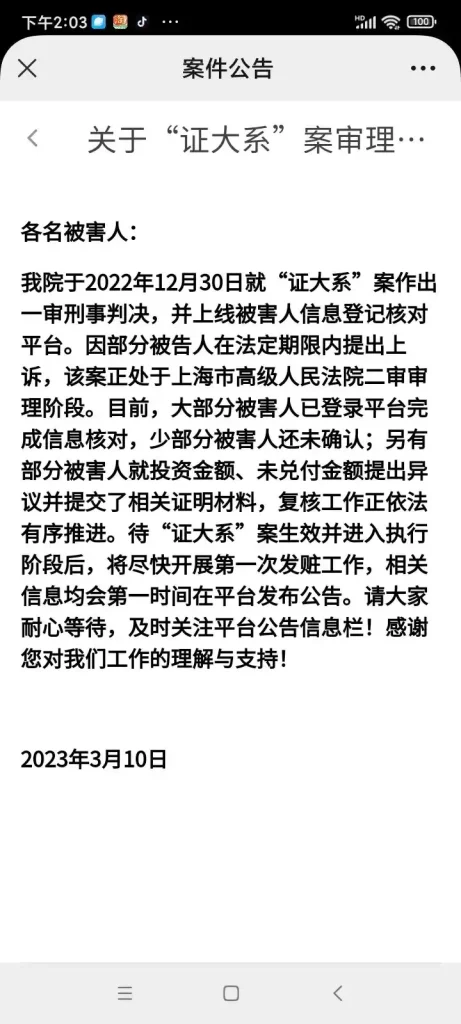 我院于2022年12月30日就“证大系”案作出一审刑事判决,并上线被害人信息登记核对平台。因部分被告人在法定期限内提出上诉,该案正处于上海市高级人民法院二审审理阶段。目前,大部分被害人已登录平台完成信息核对,少部分被害人还未确认;另有部分被害人就投资金额、未兑付金额提出异议并提交了相关证明材料,复核工作正依法有序推进。待“证大系”案生效并进入执行阶段后,将尽快开展第一次发赃工作, 相关信息均会第一时间在平台发布公告。