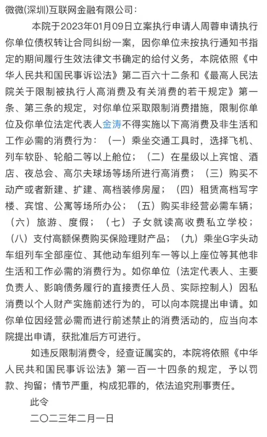 微微(深圳)互联网金融有限公司被起诉后,在执行阶段无任何可被执行资产,企业法人收到法院下达的限高消费令。