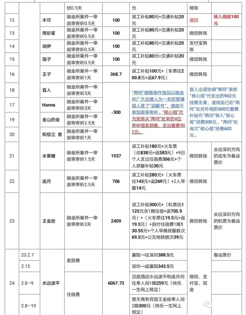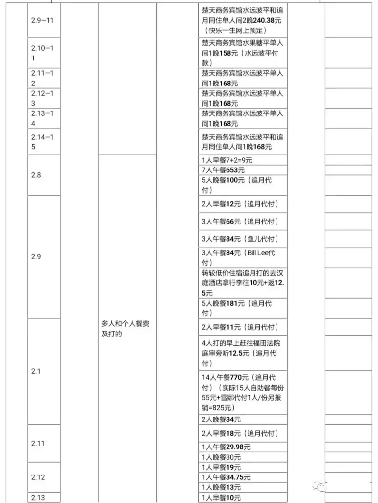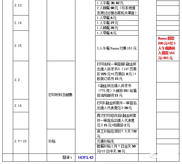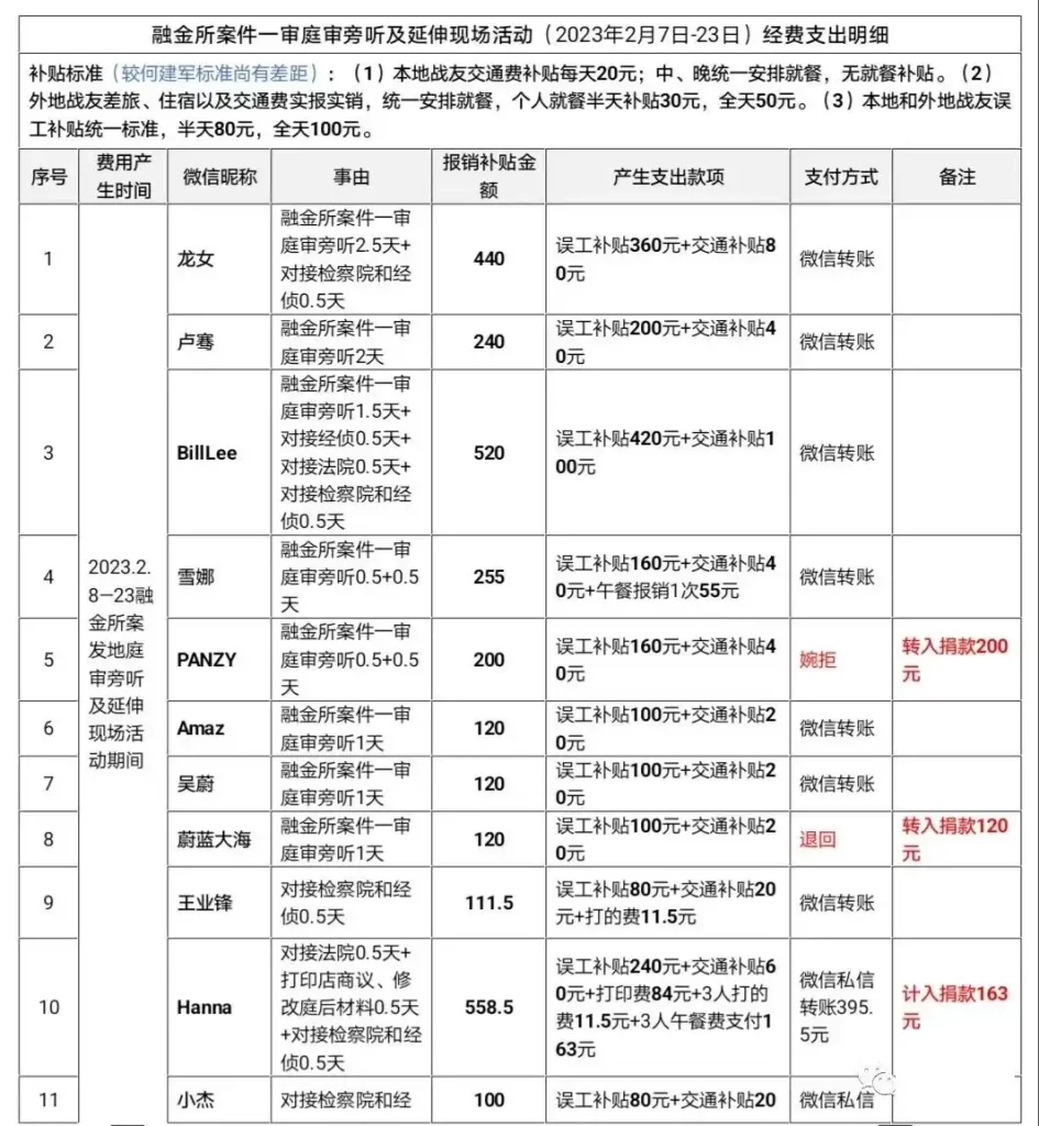 2023.2.8~23,融金所案件一审庭审旁听及延伸现场活动,参加战友达23人,经费支出14373.43元,账目明细公布如下