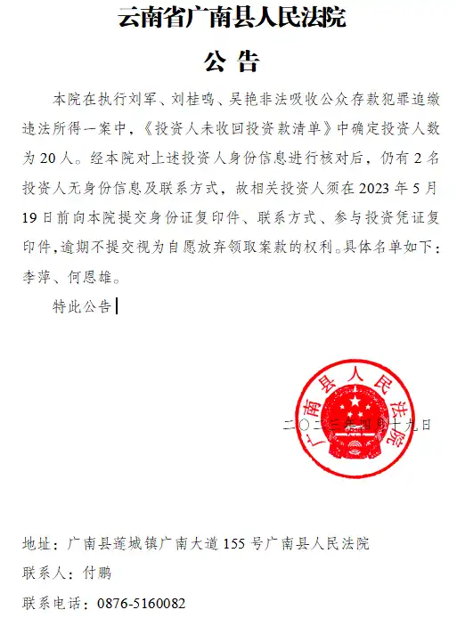 关于执行刘军、刘桂鸣、吴艳非法吸收公众存款犯罪追缴违法所得一案的公告广南县人民法院 2023-04-19 17:15 发表于云南