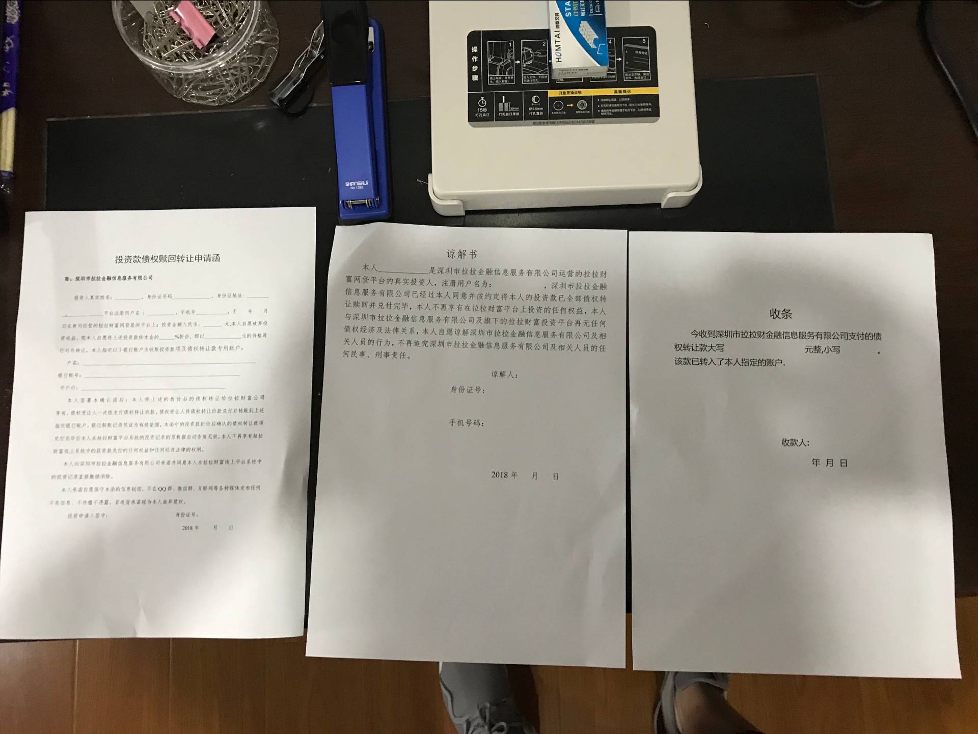 找几个托带一下节奏,然后大家一窝蜂签协议,回上几个人做做面子活。后面的大部队全部不兑付,但大部分人又签了协议,结果呵呵了······确实是回款了,我已经拿到钱了,在回家的路上······本来打算骗几张谅解书,怎猜到随随便便几百张到手······我就是那早上拿到钱之后才走的,后面的情况我就不太清楚了,因为我有朋友排在后面,我都是现在问他的······拉拉财富 2018.5.17-19:55