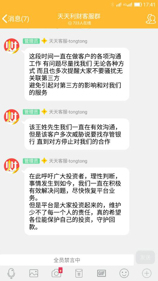 请问下群里复投的投有,排队复投要多久啊······我拍了三个月了还没一点消息······听说江光头想搞新项目小额消费贷,期望翻身,但愿如此······微信群里那个BHG估计是闲得无聊,非要弄垮天天来出他的恶气,干嘛不跟我学,画画美女,唱唱歌,也给别的投资者留点希望呢?为了自己亏那三五万搞得大伙跟吃了苍蝇似的,当初别三折摞胳膊挽袖子跟那些打算起诉天天的一起闹我也算他是条汉子。自己先止损保全了,然后忽悠别人去鸡飞蛋打,卑鄙······我希望能说上话的人,给老板说一声,大家都是投资者,能不能给大家回一部分,不能有人吃着,有人看着,这样的处理会逼大家做出相应的不良反应······天天利财 2018.5.19-19:34